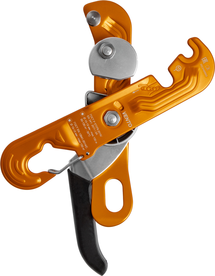 Стопор присоединяется к привязи через карабин. При этом веревка устанавливается и вынимается из устройства без необходимости его снимания с привязи. Подвижная пластина устройства имеет открывающуюся скобу для фиксации на карабине. Канат закладывается в одной плоскости, что гарантирует минимальное скручивание веревки при длительных спусках. Рекомендуется использовать на канатах Ø 10-12 мм «Высота» и «Профистатик» ТМ VENTO (ГОСТ EN 1891/А).