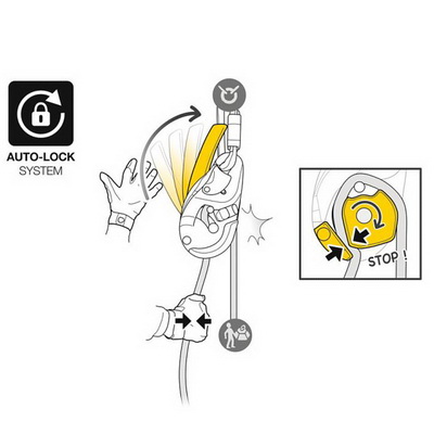 - система AUTO-LOCK автоматически переводит устройство в положение блокировки при отпускании рукоятки. Дополнительная фиксация каната не требуется;
